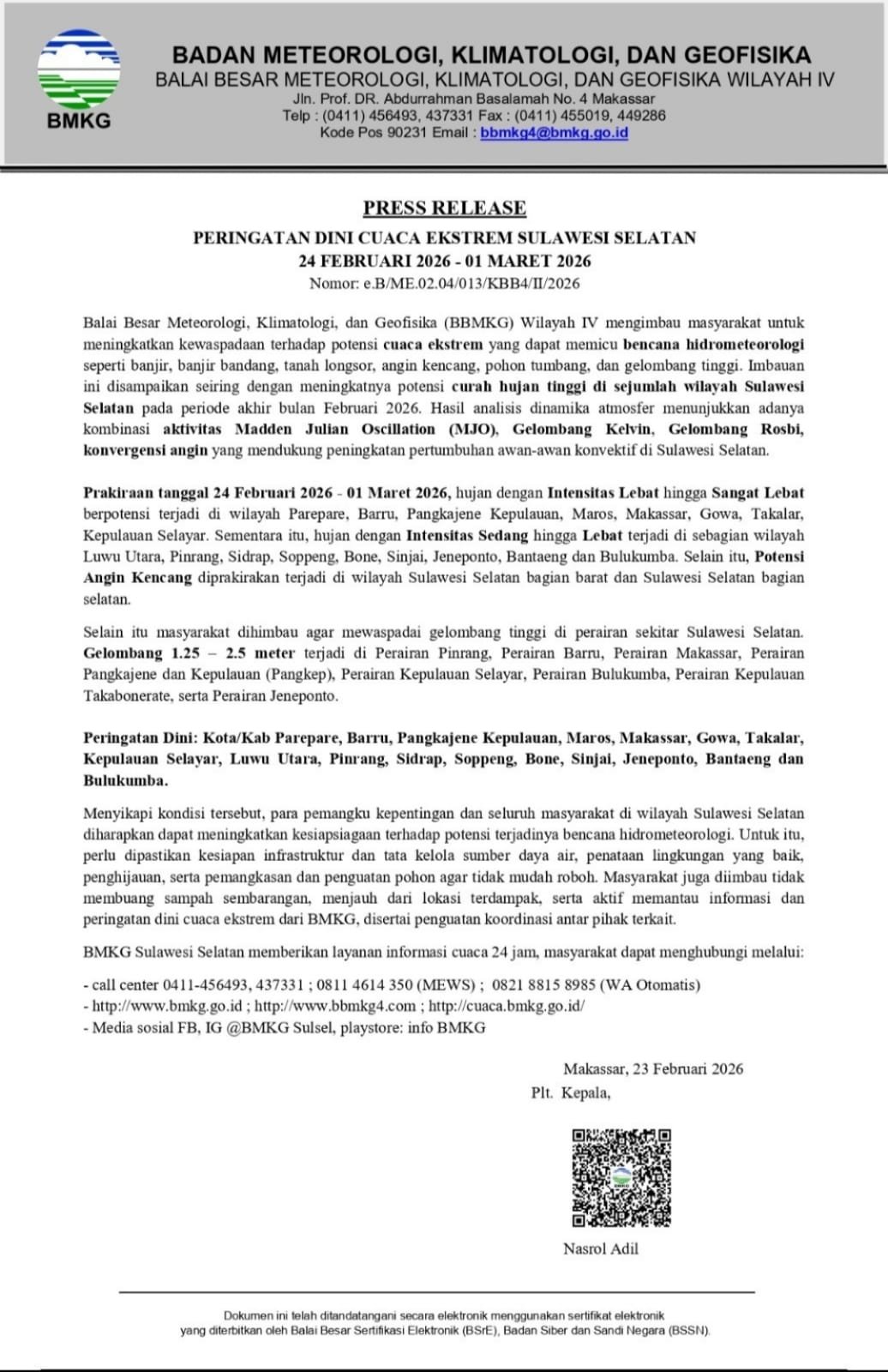 Pihak BMKG juga meminta warga untuk terus memantau informasi terkini melalui layanan 24 jam di call center (0411) 456493, aplikasi Info BMKG, atau media sosial resmi @BMKGSulsel.(Red/*)