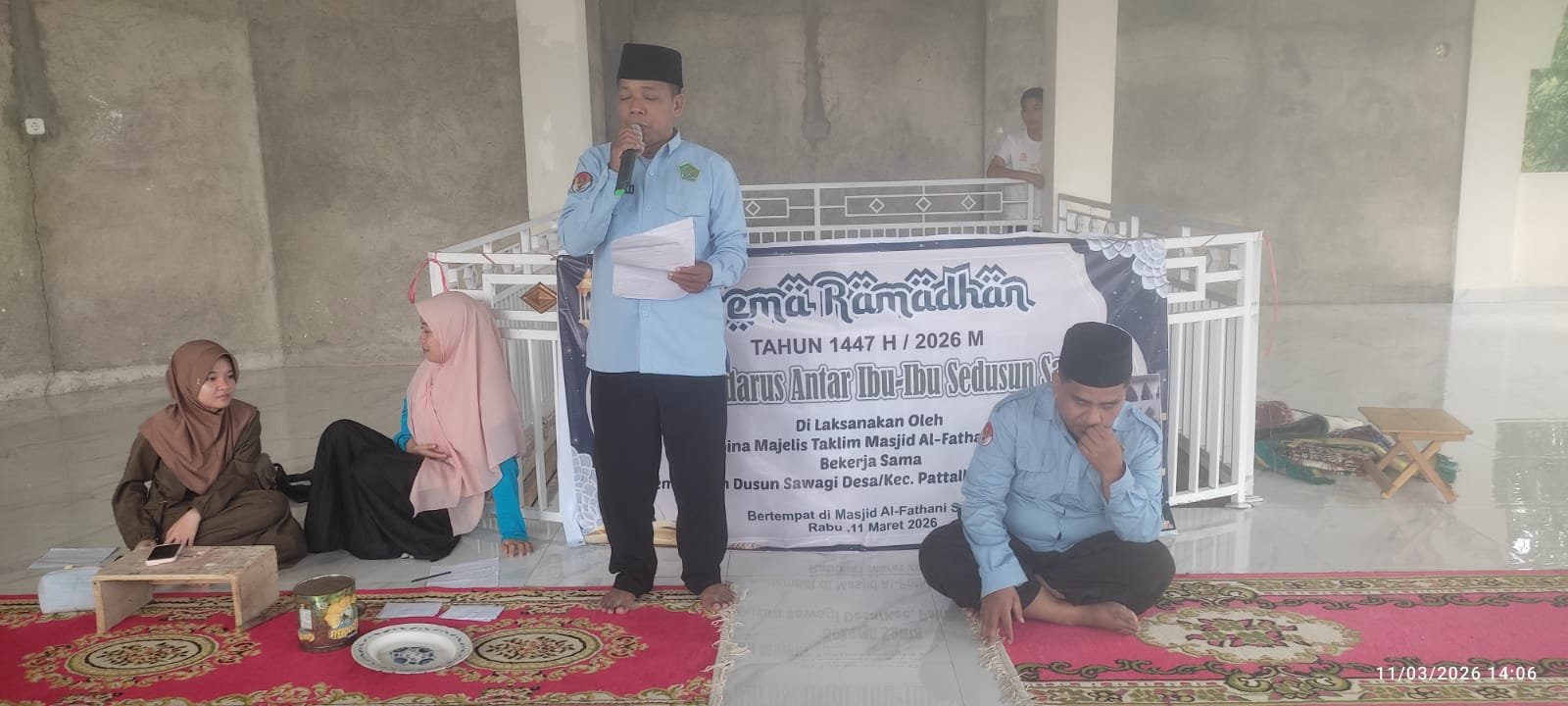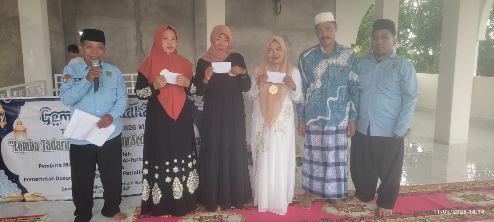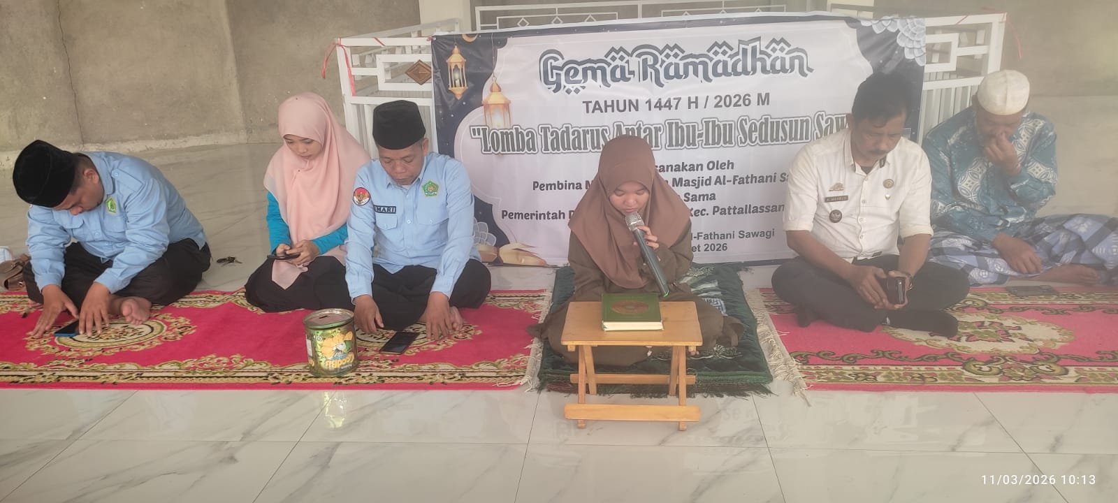 Lomba Tadarus Al-Qur’antar ditutup oleh Muktadir Khair,S.Pd I mewakili KUA kecamatan Pattallssang dilanjutkan penyerahan hadiah bagi pemenang lomba “Gema Ramadhan 1447 H 2026 M Lomba Tadarus Al-Qur’an Antar Ibu Ibu Sedusun Sawagi di laksanakan oleh Pembina Majelis Taklim Masjid Al-Fathani Sawagi Bekerja Sama Pemerintah Setempat,Rabu 11/03/2026/14.03(NUR)