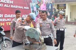 Kegiatan press release ditutup dengan pemusnahan 17 knalpot tidak sesuai spesifikasi (knalpot brong) hasil penindakan selama Operasi Keselamatan Seulawah 2026. (RANY)